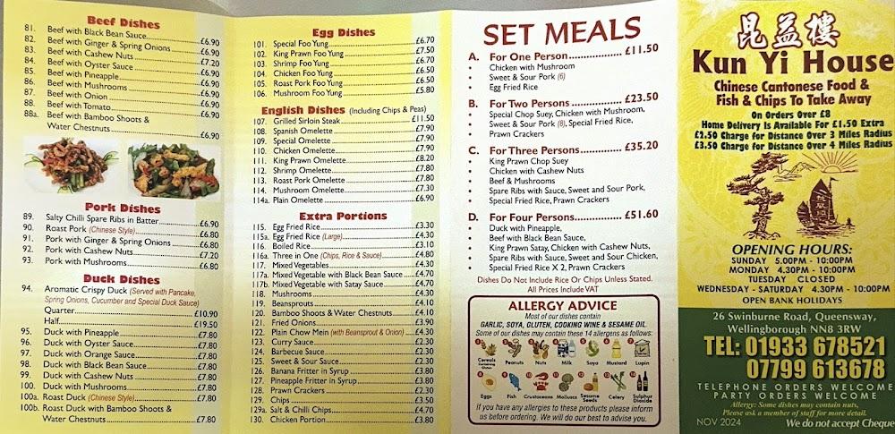 Located at 26 Swinburne Rd, Wellingborough NN8 3RW, Kun Yi House stands as a beloved destination for both locals and visitors craving quality Chinese cuisine. Since its opening, this establishment has built a reputation for serving up delicious dishes alongside a warm, family-friendly atmosphere. The restaurant features wheelchair-accessible seating, making it convenient for everyone to enjoy a delightful meal. With ample free street parking available, visitors can easily stop by any day of the week. Kun Yi House prides itself on exceptional service, evident from the friendly and efficient staff who work tirelessly, even during busy hours. Such commitment consistently earns repeat customers and fond memories, which are woven into the delightful fabric of the community. Open for lunch and dinner, it’s the perfect spot for a quick bite or a more relaxed dining experience with family and friends.